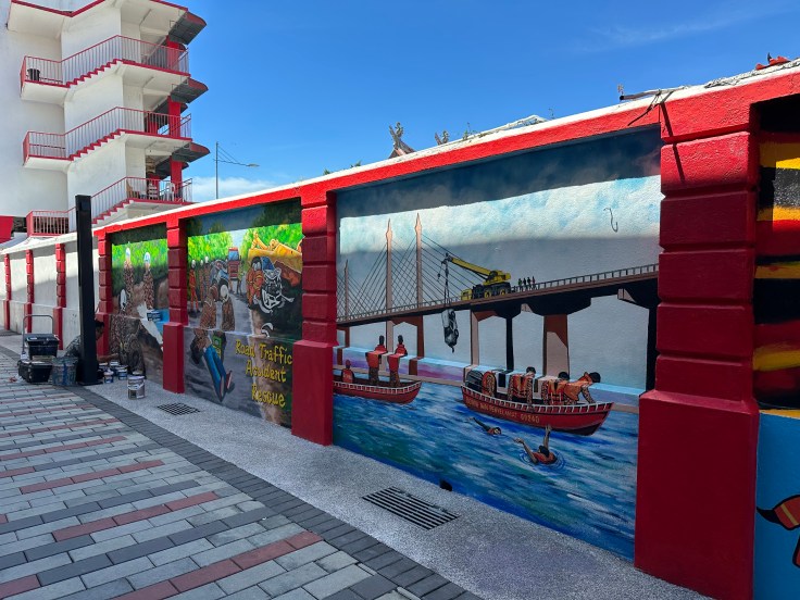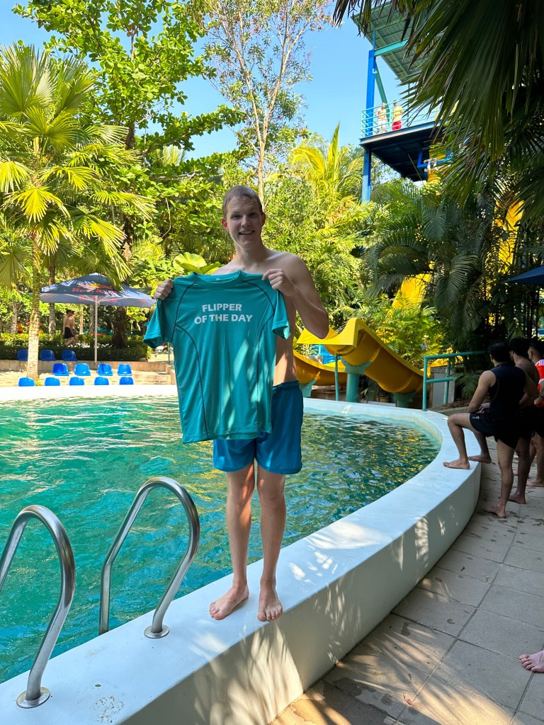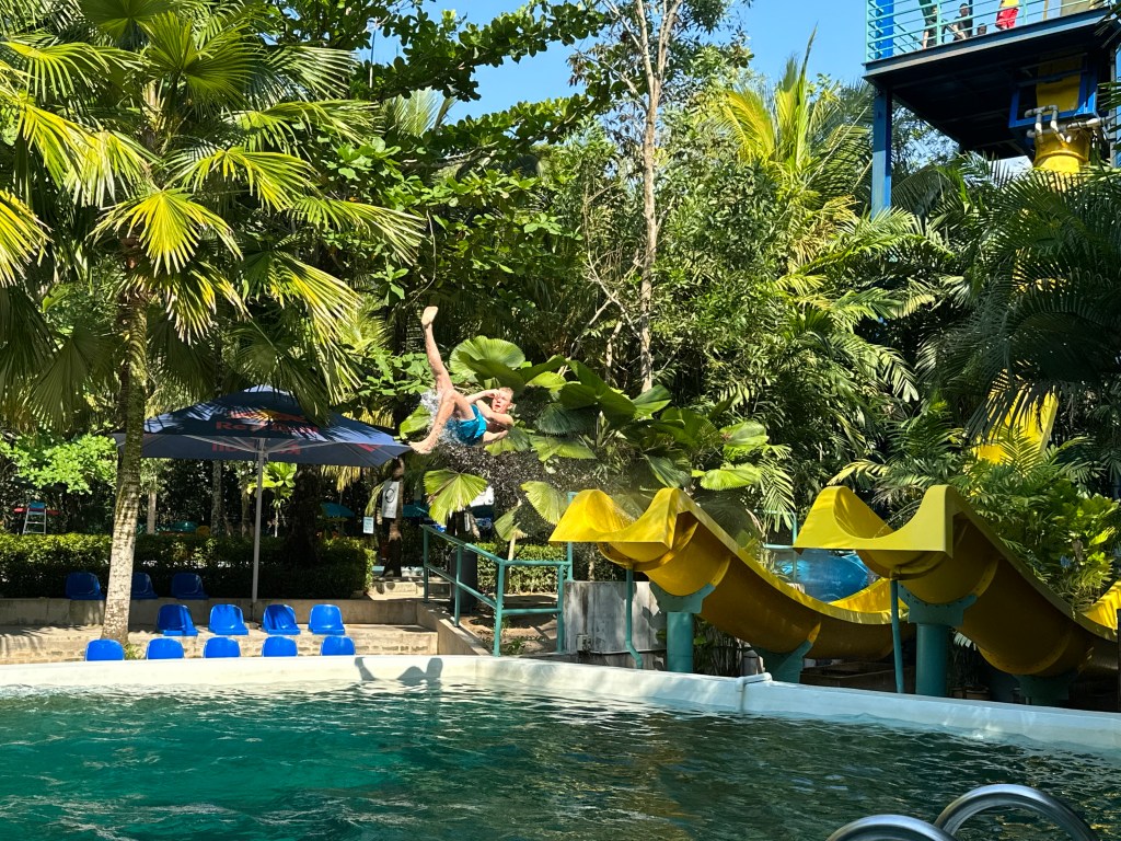 Bekannt ist die Stadt für die berühmten Straßenmalereien und die vielen kleinen Essensmärkte. Für uns eine ideale Mischung aus Sightseeing und Verköstigungen. Auch wenn wir nicht mehr am Strand liegen, sind die Temperaturen mit täglich bis zu 35 Grad bei praller Sonne sehr erdrückend. Gerade in der Nachmittagssonne ist das Sightseeing dann von viel Schweiß geprägt. Für den letzten Tag entschieden wir uns sogar für Kontrastprogramm und sind in den berühmten Escape Park gefahren. Vor allem die Teilnahme am dortigen Banana-Flip Wettbewerb hat sich für Tim total gelohnt. 😀