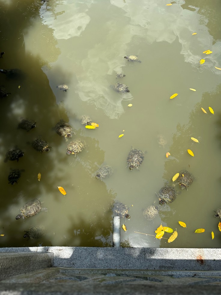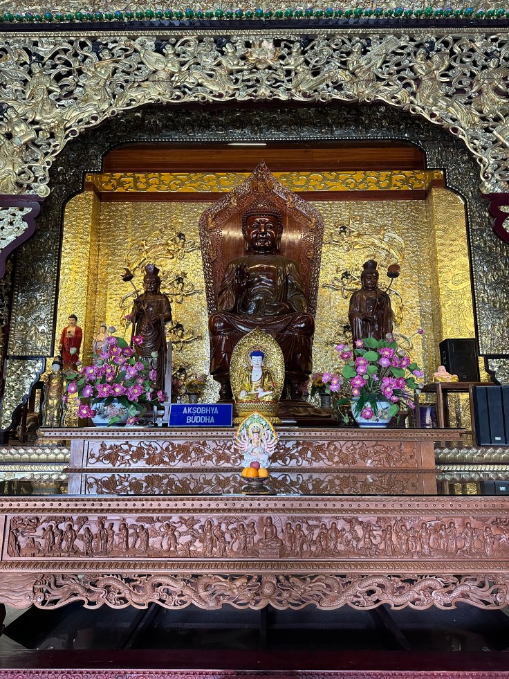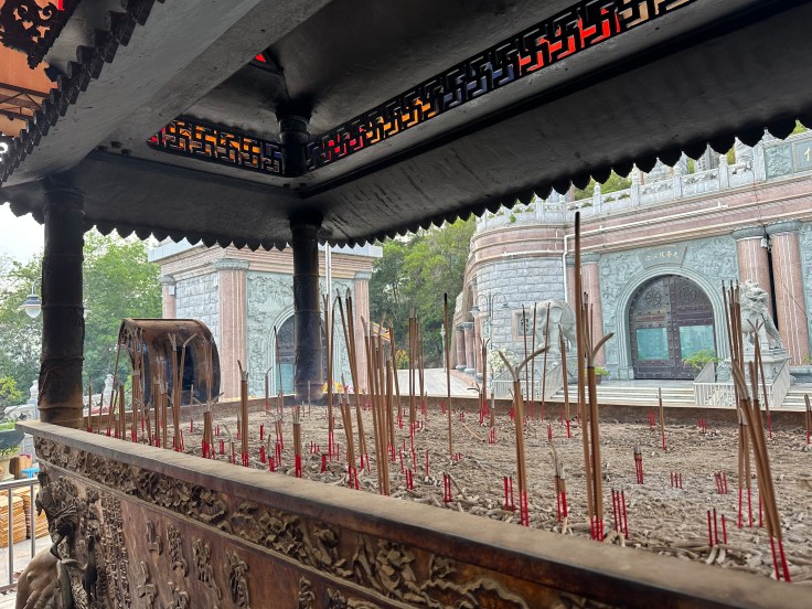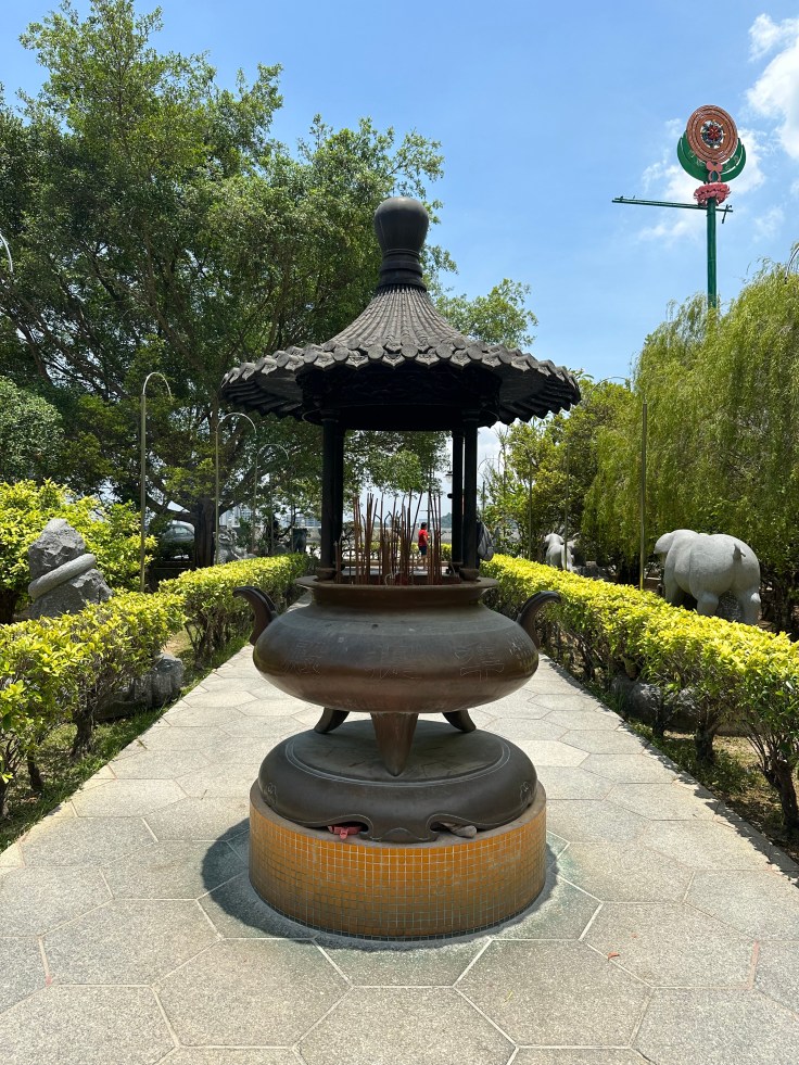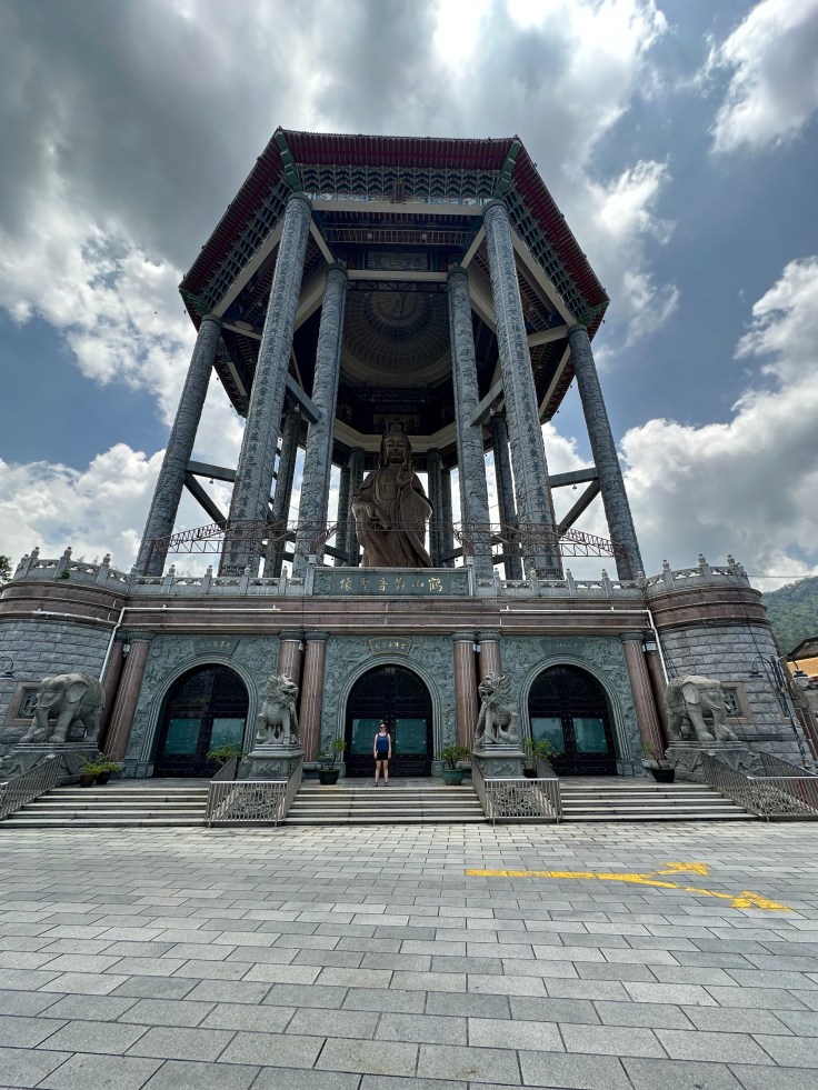 Ein besonderes Highlight ist die 30 Meter hohe Kuan Yin Bronzestatue, die seit 2009 von einem nachträglich errichtetet Pavillon geschützt wird. Leider konnten wir aufgrund von Bauarbeiten den Pavillon nicht betreten. Dennoch sind die Bilder, vor allem wenn man auf Alina als vergleich achtet beeindruckend.
