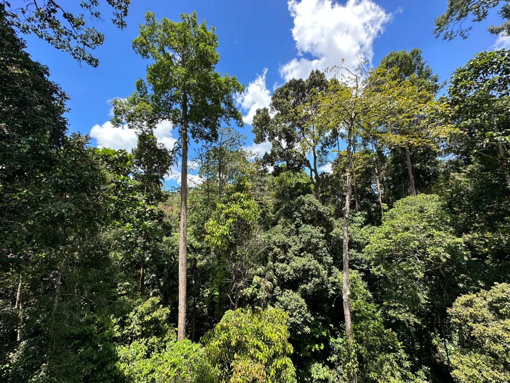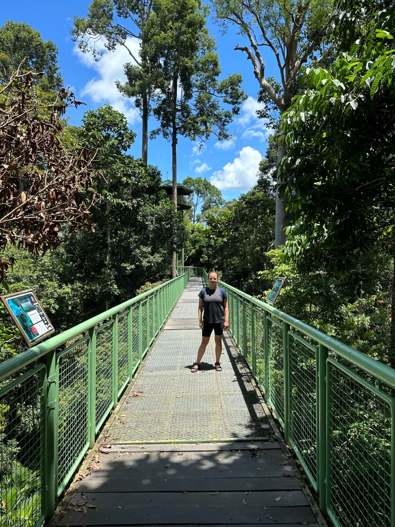 Das Rainforest Discovery Center haben wir direkt im Anschluss um die Mittagszeit besucht. Zu Fuß haben wir für die knapp 2 Kilometer gut 20 Minuten benötigt. Für die umgerechnet 4 Euro Eintritt pro Nase, kann man hier den Dschungel und seine Tiere selbst erkunden. Obwohl wir schon „besondere“ Erfahrungen mit dem Dschungel im Taman Negara Nationalpark machen konnten, haben wir uns darauf eingelassen. Der Fokus lag dieses Mal zum Glück nicht auf 5 Stunden wandern, sondern auf dem Entdecken und Beobachten im ganz eigenen Tempo. Für eine besondere Perspektive sorgt dafür der 363 Meter lange Canope Walk mit seinen Aussichtsplattformen, durch den man alles auf Baumgipfelhöhe erkunden kann. Wir haben neben einigen Vögeln (die wir natürlich nicht eindeutig identifizieren konnten) vor allem viele Borneo-Hörnchen gehört und auch gesehen. Diese sind mit bis zu 40 cm Länge deutlich größer und auch Lauter als die europäischen Artgenossen. (siehe Video)